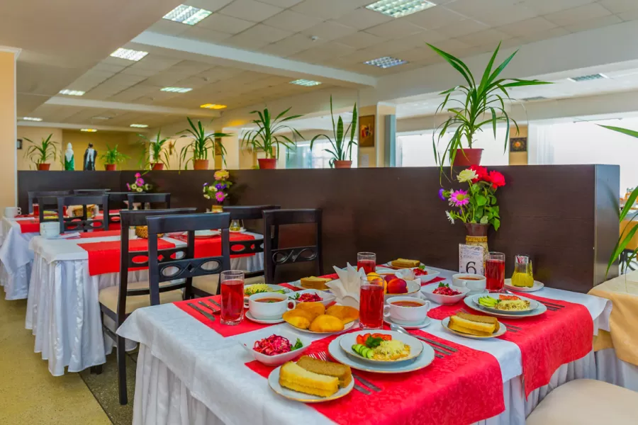 Трапезы проходят в просторных залах с ресторанным интерьером по системе «меню-заказ»: посетители самостоятельно выбирают блюда из предложенного меню, с учетом персональных рекомендаций диетолога. Все системы питания составлены по формуле сбалансированного сочетания продуктов. В здравнице есть и «переходная» диета, которая помогает постепенно перестроиться организму на базовое питание после лечебного рациона.