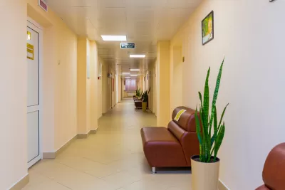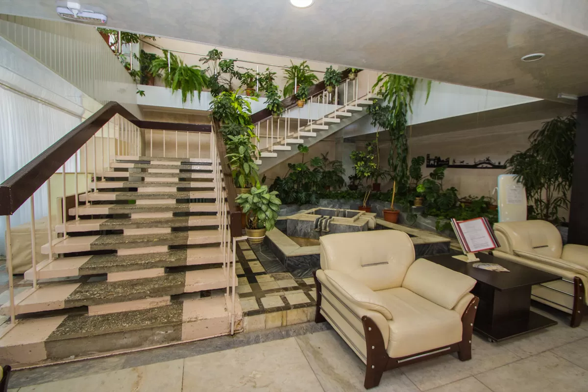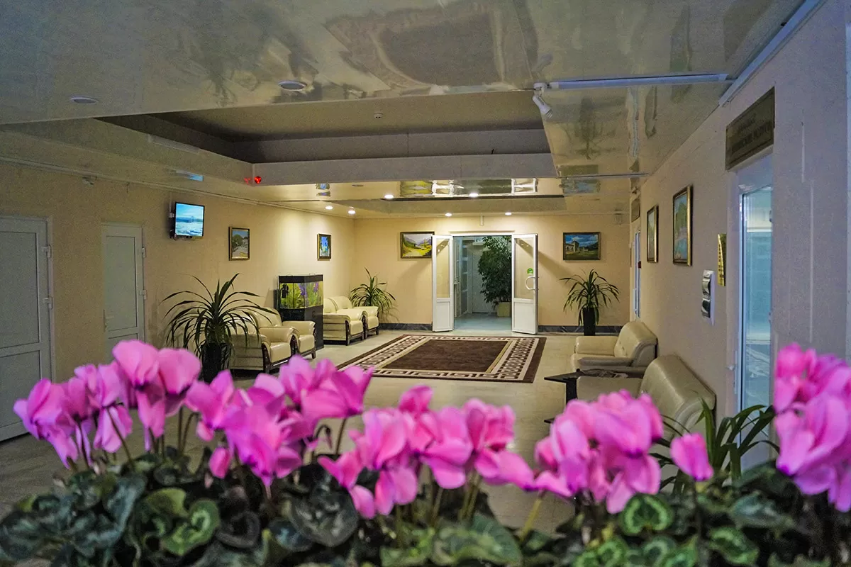 - Шикарные фойе и зоны отдыха. В санатории отдохнуть можно в любом месте. Всюду организованы уютные релакс-зоны с мягкой мебелью и живыми растениями. В просторных фойе и коридорах также установлены удобные кушетки и диваны со столиками.