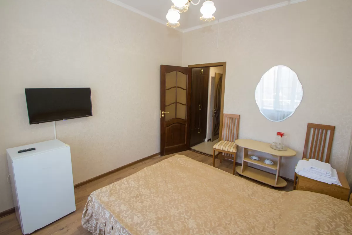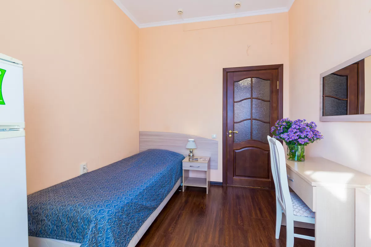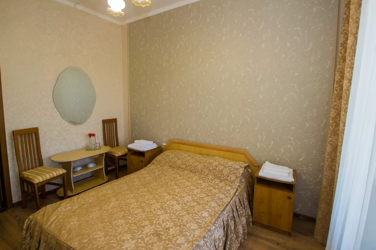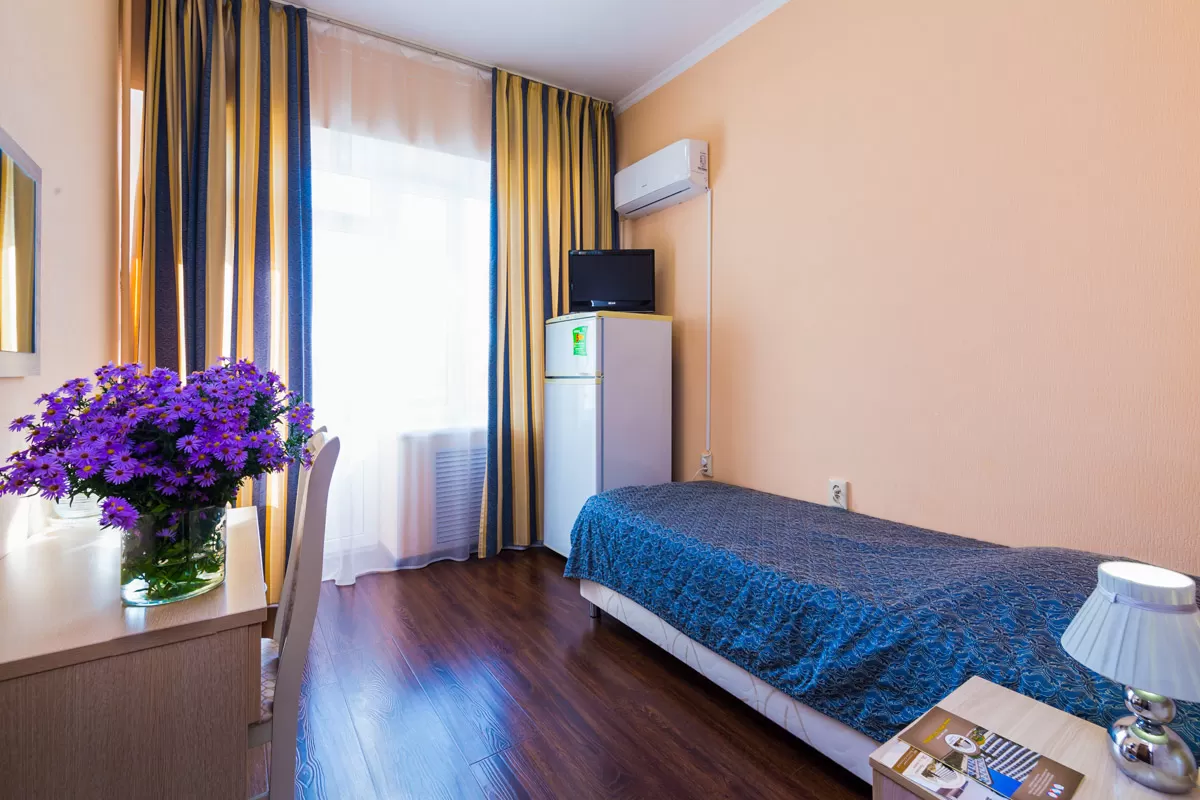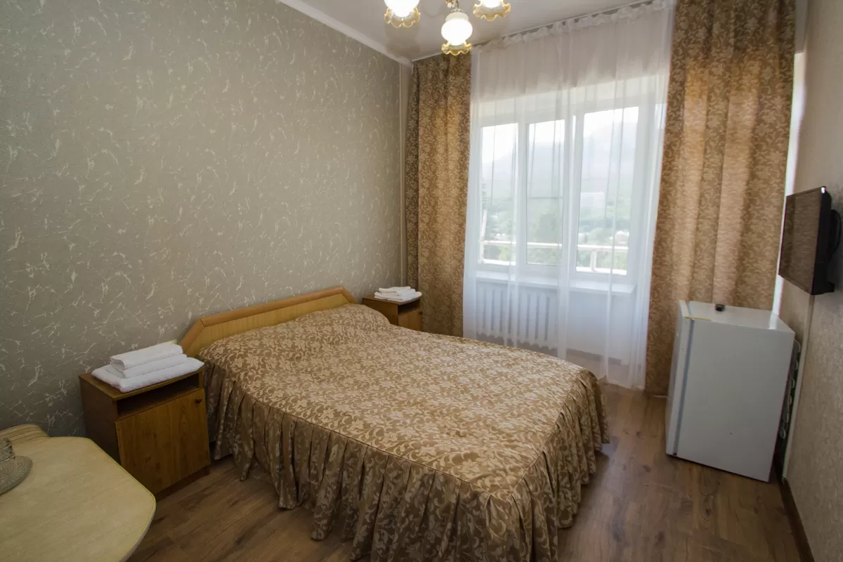 В комнате с лаконичным интерьером стоит односпальная кровать с удобным матрасом, рядом с которой расположена тумбочка с настольной лампой. Для чаепитий предусмотрен стол со стулом. В апартаментах также имеется бытовая техника - телевизор, холодильник, кондиционер и фен. Обстановку дополняет приятный текстиль - ковер, шторы и покрывало. Из окна можно увидеть прекрасные пейзажи Железноводска, лес и горы.
